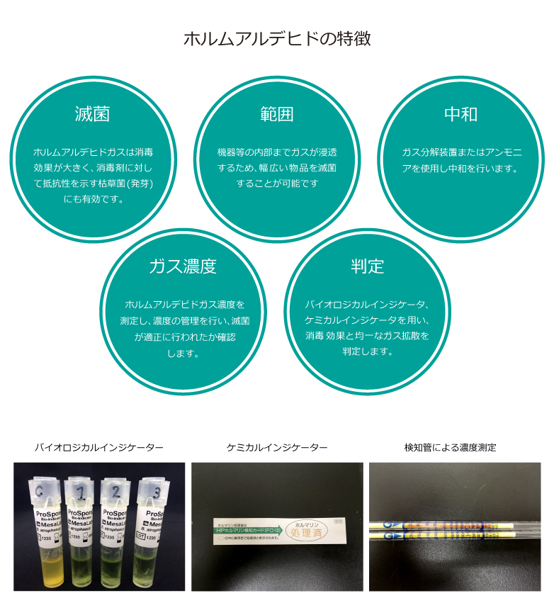 ホルムアルデヒドガスは消毒効果が大きく、薬剤に対して抵抗性を示す枯草菌(発芽)にも有効です。
